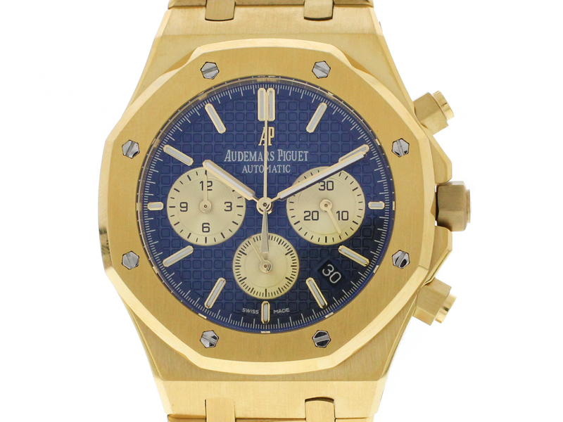 Das Gehäuse der Uhr, gefertigt aus 18 Karat Gelbgold, strahlt eine warme und reiche Eleganz aus, die sofort ins Auge fällt. Gelbgold, als eines der edelsten Materialien in der Uhrmacherei, verleiht der Uhr eine exklusive und prestigeträchtige Anmutung. Die Oberfläche des Gehäuses ist sorgfältig poliert und verleiht der Uhr einen glänzenden und anspruchsvollen Look, der die luxuriöse Ausstrahlung der Uhr betont. Die ikonische achteckige Lünette, festgehalten von acht sichtbaren Schrauben, ist ein unverwechselbares Merkmal der Royal Oak-Kollektion und trägt wesentlich zum charakteristischen Design der Uhr bei.